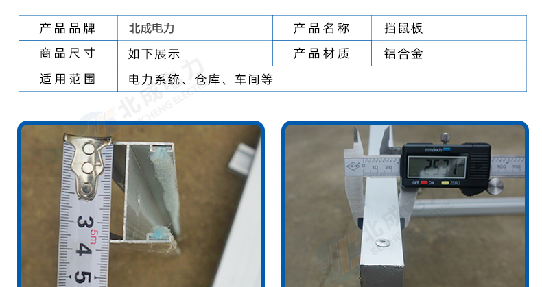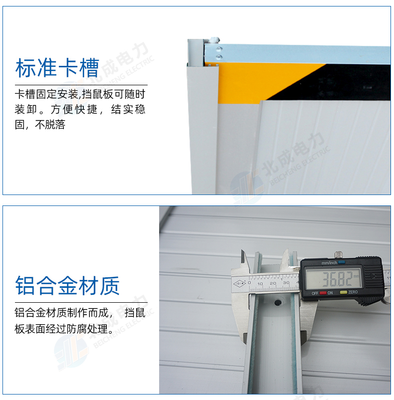 新型鋁合金材質擋鼠板替代老式擋鼠板材,實用、結實、耐用、使用時間長。由擋鼠板主板面和卡槽夠成,外觀可見部分為鋁合金定制,且貼有黃黑色的反光警示貼。