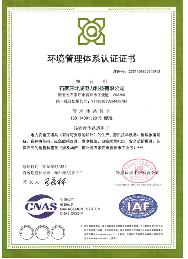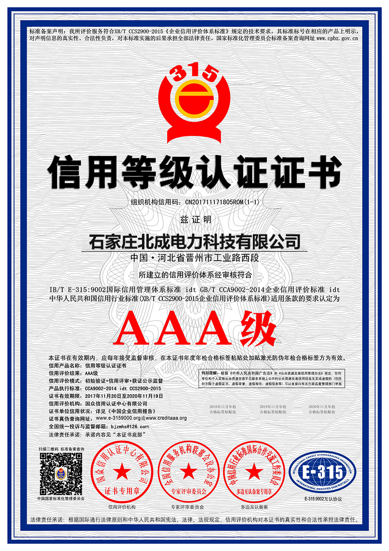 石家莊北成電力科技有限公司坐落于晉州市電力開發區,憑借雄厚的技術力量,齊全的檢測手段,品質的安全保證;通過國家檢測認證等,在生產和檢測環節嚴格執行國家統一質量標準,并制定了一整套完善的質量管理和監督體系,公司產品均經過安全工器具質量監督檢驗,頒發了產品檢測報告。連續多年被合作客戶稱為文明誠信、質量守信單位!
